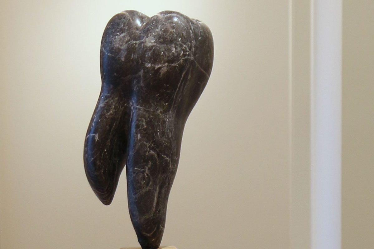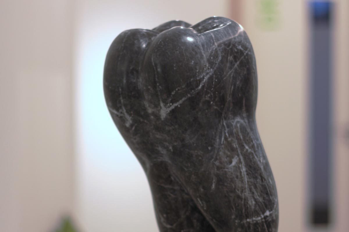 „Nahezu 80 Stunden Arbeit stecken in unserem Specksteinzahn. Für mich war es gleichzeitig Pilotprojekt, als auch Meisterstück. An so einem Stück Fels kann man sich wirklich die Zähne ausbeißen. Aber durch learning by doing und mit viel Durchhaltevermögen entstand letztlich unser XXL Zahn. Die Form war einerseits schon in Gedanken vorhanden, andererseits wurde sie auch durch den Stein vorgegeben. Bei dem Holzstamm und der Stahlplatte haben mir Freunde geholfen. Mit einem Gewicht von ca. 60 kg ist ein stattliches Kunstwerk entstanden, zu bewundern in unserer Praxis.“