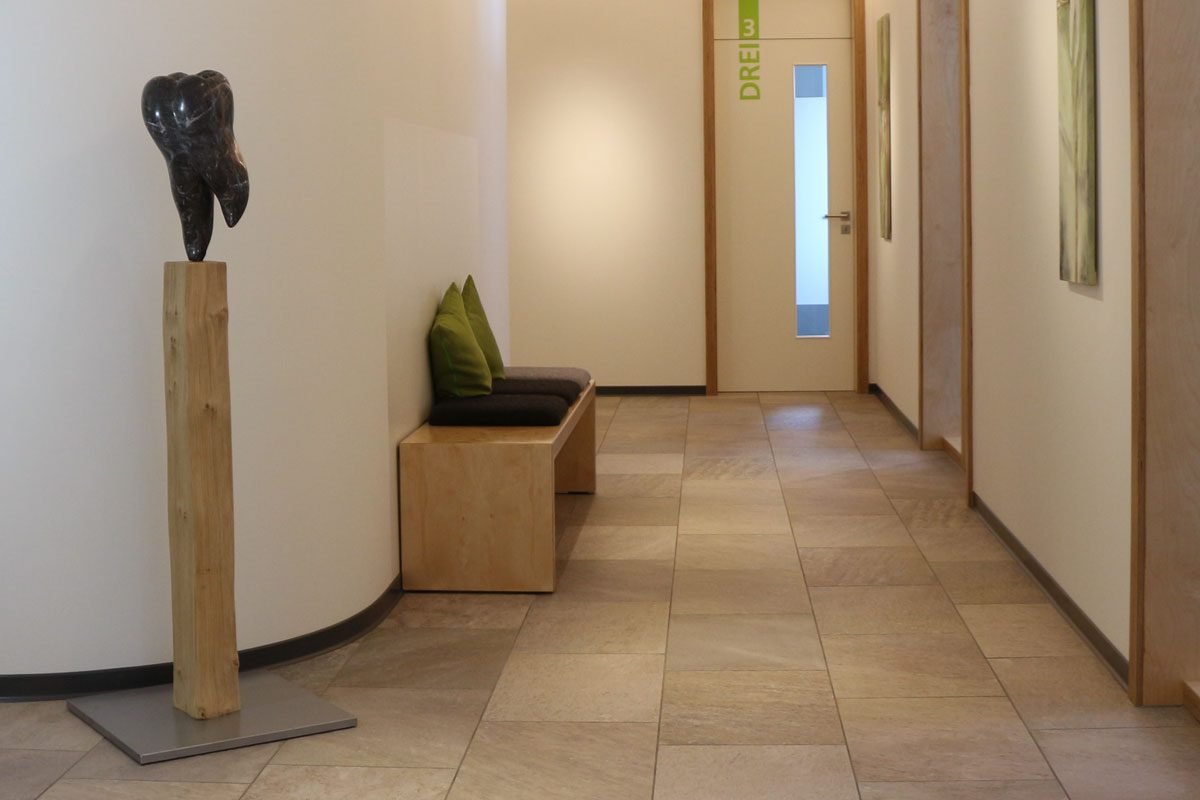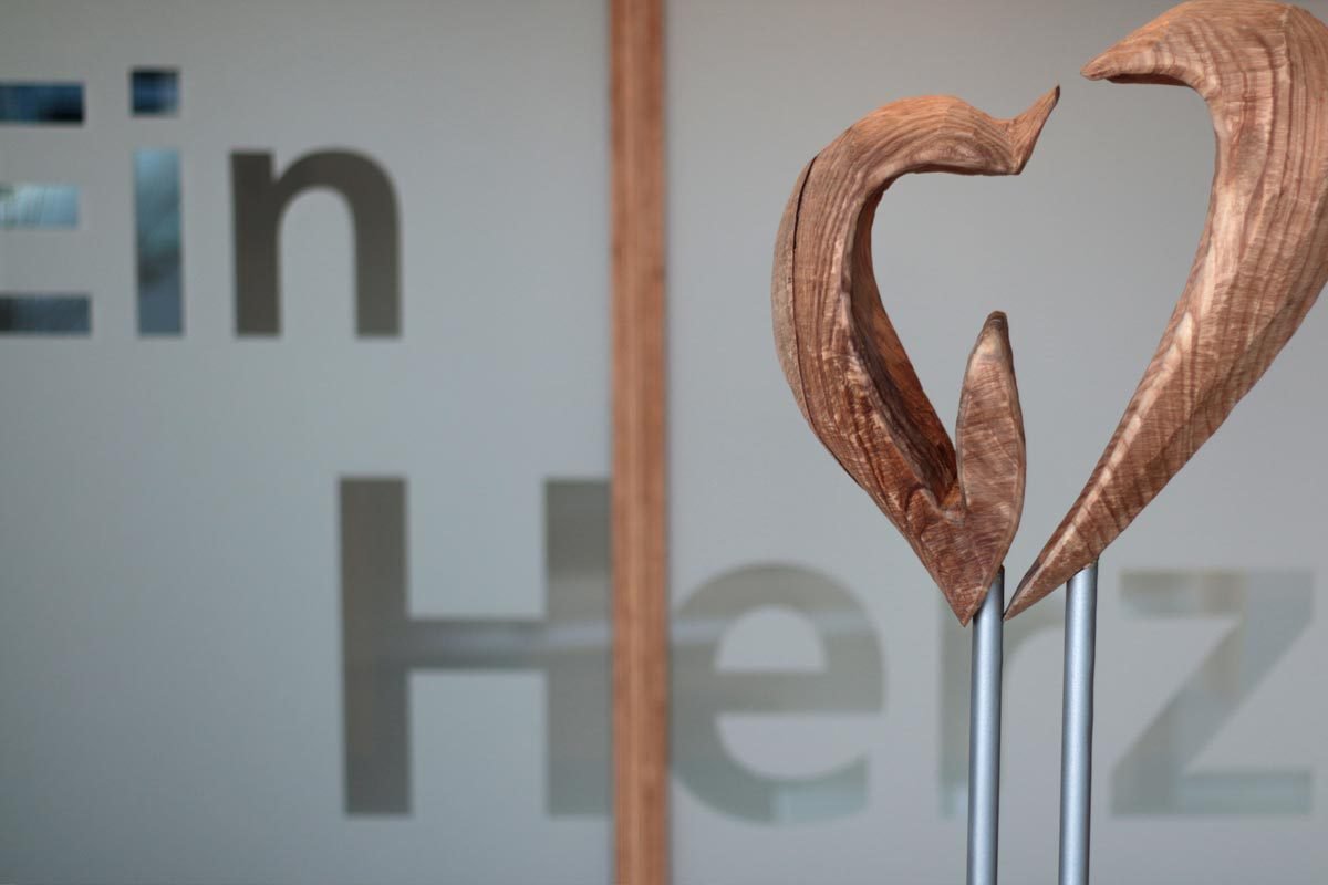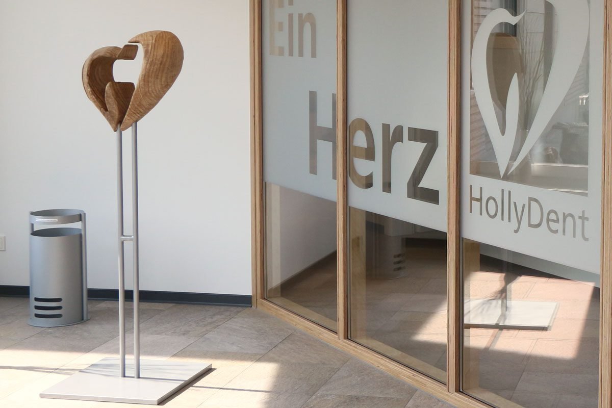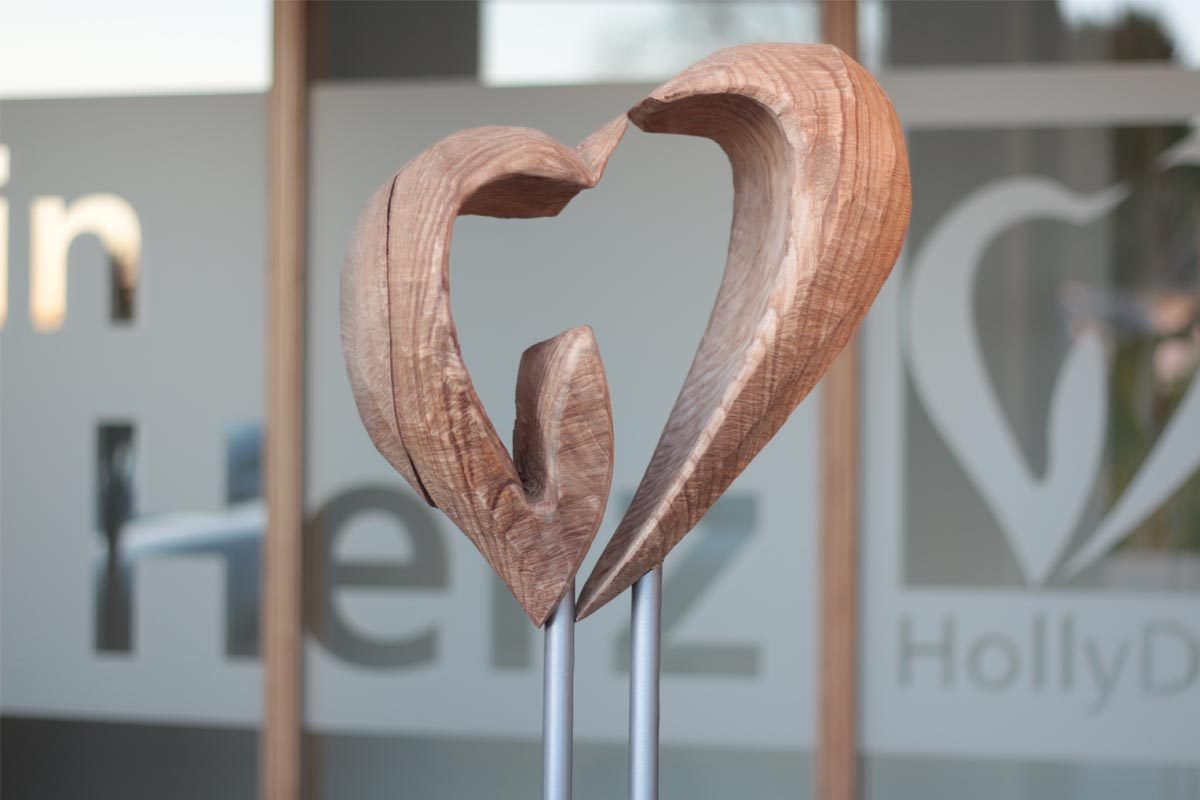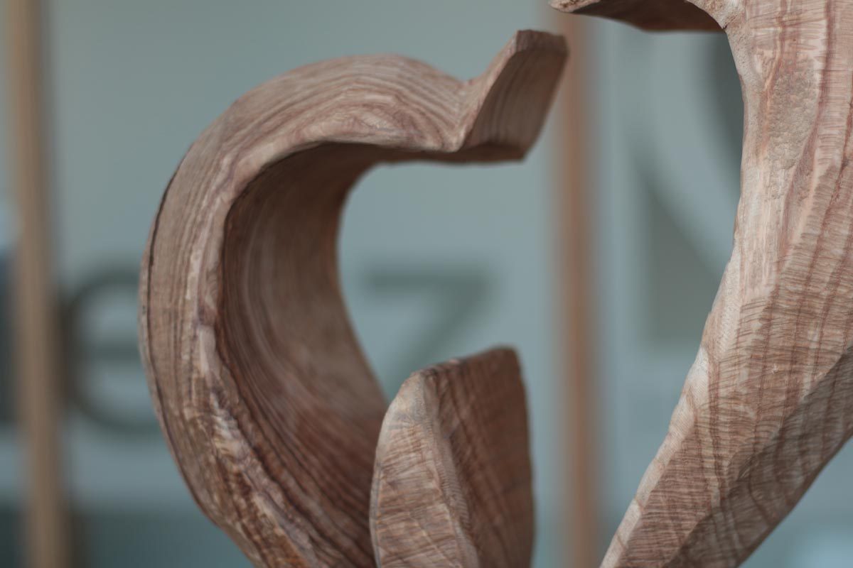 Die zwei Hälften des Logos bilden eine harmonische Einheit ohne direkt miteinander verbunden zu sein. Die Stahlstäbe wurden raffiniert an den Holzformen befestigt und tragen dazu bei, unserem Logo eine gewisse Ausstrahlung des Schwebens zu verleihen . Die Kombination der unterschiedlichen Materialien Holz und Stahl finden Sie auch im Empfangsbereich wieder. Als ersten Blickfang direkt im Eingangsbereich vermittelt die Skulptur zu gleich Wertigkeit und Gemütlichkeit.“
