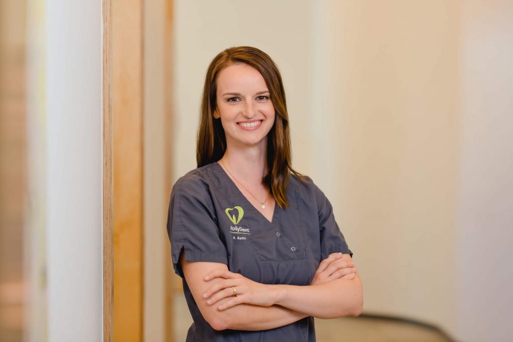 Frau Dr. Renate Batke studierte Zahnmedizin an der RWTH Aachen von 2008-2013 und absolvierte ihre zweijährige Assistenzzeit teils in Köln und Düsseldorf und teils bereits in Waldbröl bei HollyDent. Seit der Assistenzzeit spezialisiert sich Frau Dr. Batke im Bereich der Craniomandibulären Dysfunktion und absolvierte 2017 ihr CMD Curriculum nach Prof. Bumann. Seit 2020 ist sie zusätzlich spezialisierte Zahnärztin für zahnärztliche Schlafmedizin und eingetragenes DGZS-Mitglied (Deutsche Gesellschaft für Zahnärztliche Schlafmedizin). Nebenbei promovierte sie 2019 am anatomischen Institut der Universität zu Köln. Gemeinsam mit Philip und Nathalie den Hollander gründete sie als Juniorpartnerin die Gemeinschaftspraxis HollyDent Anfang 2019.